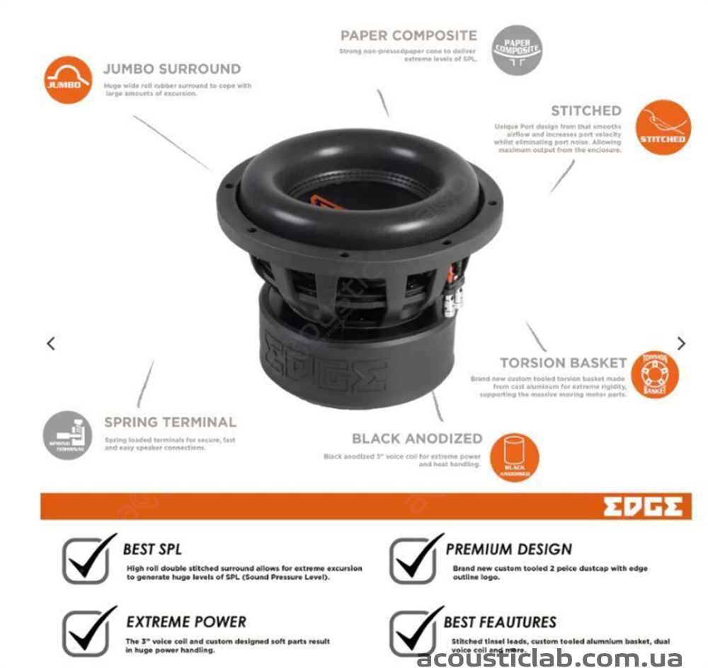 Сабвуферний динамік Edge EDX10D2-E3 є потужним і високоякісним пристроєм, спроектованим для справжніх цінителів якісного звуку і глибоких басів. Серія об'єднує в собі передові технології та високу магнітну ефективність, забезпечуючи винятковий звуковий тиск і точне відтворення низьких частот.